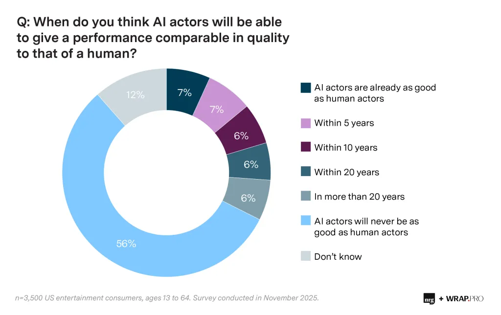 Consumers are also skeptical about AI actors, according to an NRG study done in conjunction with TheWrap. The survey found 56% of people felt AI actors would never be able to deliver a human-caliber performance.
