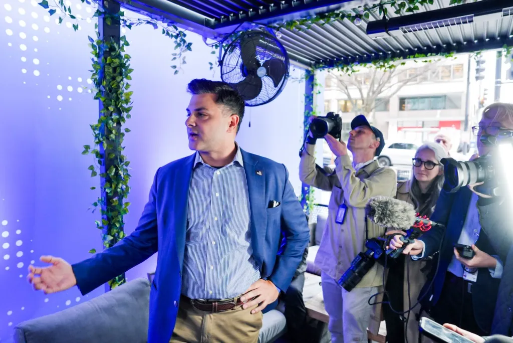 I took my place amongst the other journos, and soon after, Neal Kumar, Polymarket’s Chief Legal Officer, came from inside to take some questions and dish out canned responses. “We view this as our ‘coming out’ party in D.C.,” he beamed. “We’ve proven that the concept of prediction markets exist, we’ve proven that the concept is here to stay, and we want to be a part of the conversations here in D.C. Where better to have the conversation than in a bar?”