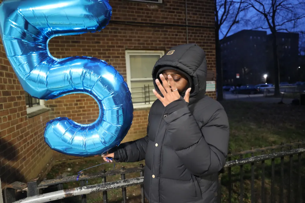 Coleman’s older sister, 21-year-old Julani Bannister pays tribute to her brother, holding up five fingers and a “five” shaped balloon, the number he wore playing football. William C Lopez/New York Post
