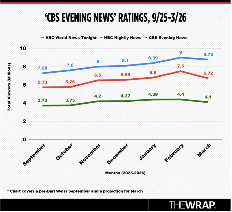 Bolies breaks down CBS News’ ratings, as its marquee morning show and evening newscast continue to struggle under Editor-in-Chief Bari Weiss