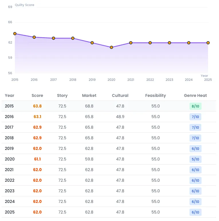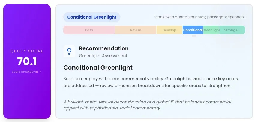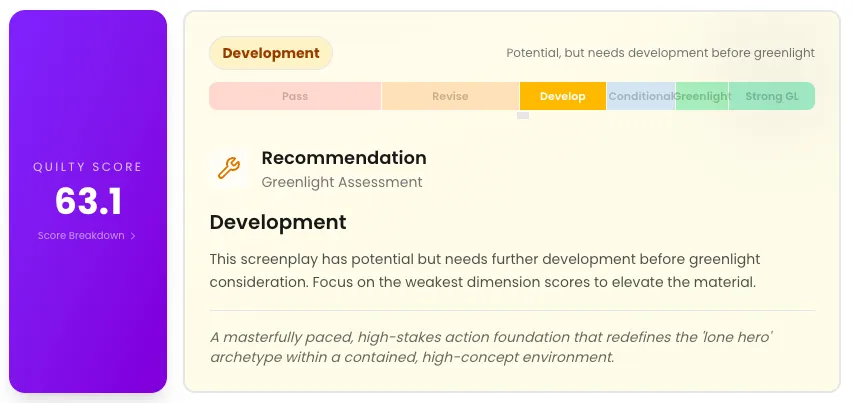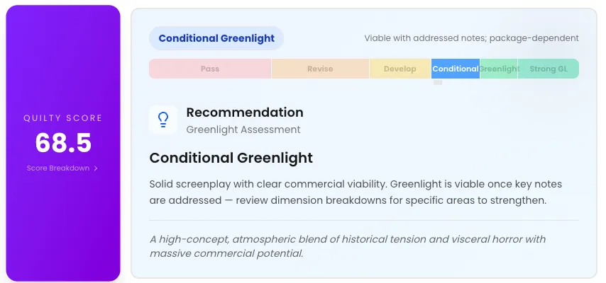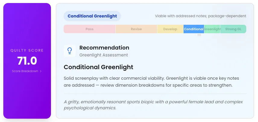 This film received the highest Quilty score at 71, which was enough to rate it a “conditional green light.” It lauded the script’s “visceral third-act pivot” and “complex protagonist psychology,” but dinged its pacing and repetition issues in the second act and “on-the-nose” dialogue from the antagonist.