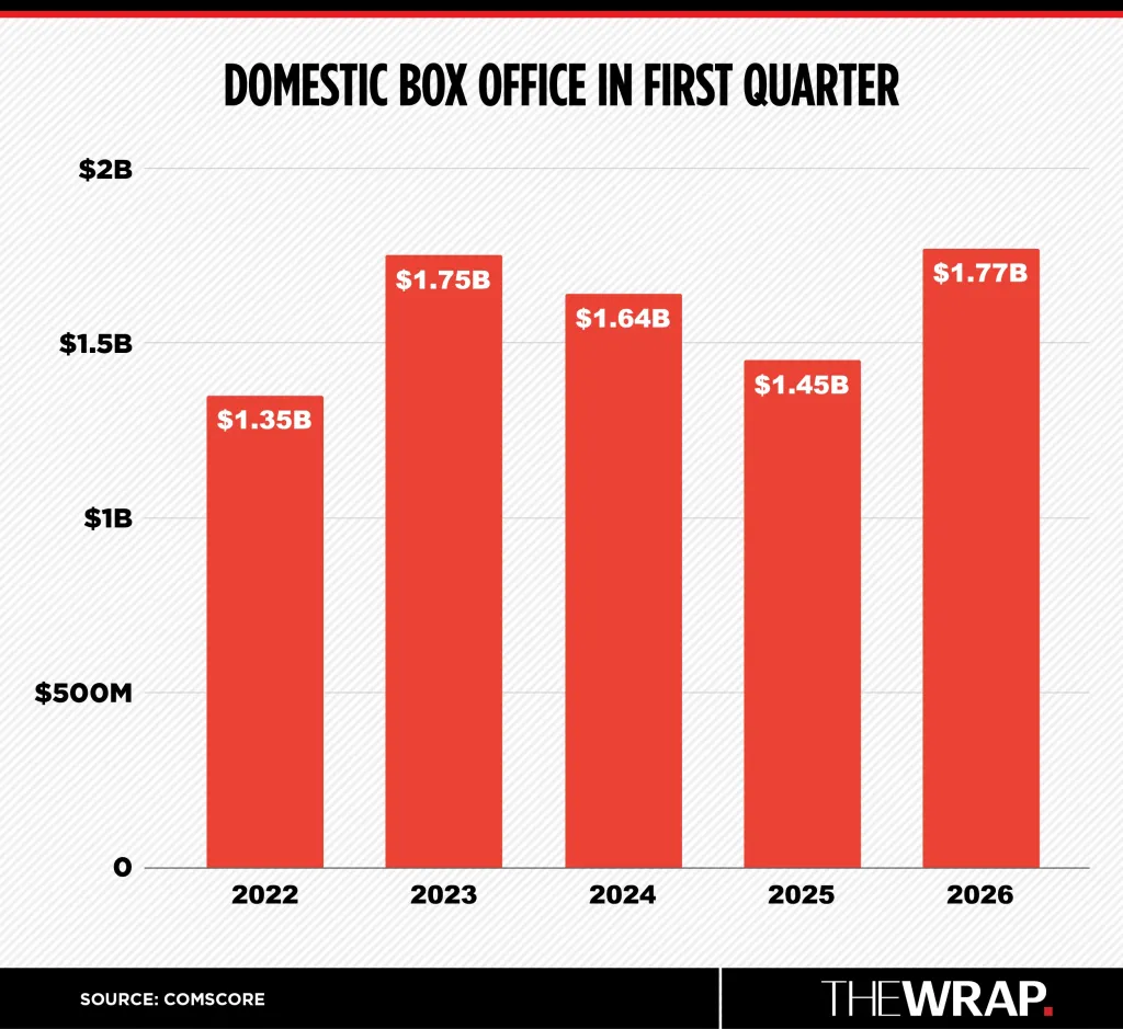 According to data from Comscore, overall domestic grosses for the year through the end of March reached $1.77 billion, just topping the first quarter total for 2023 by approximately $20 million. It is also 22% ahead of the anemic $1.45 billion first quarter of 2025, which suffered the lowest grossing non-pandemic March in 30 years.