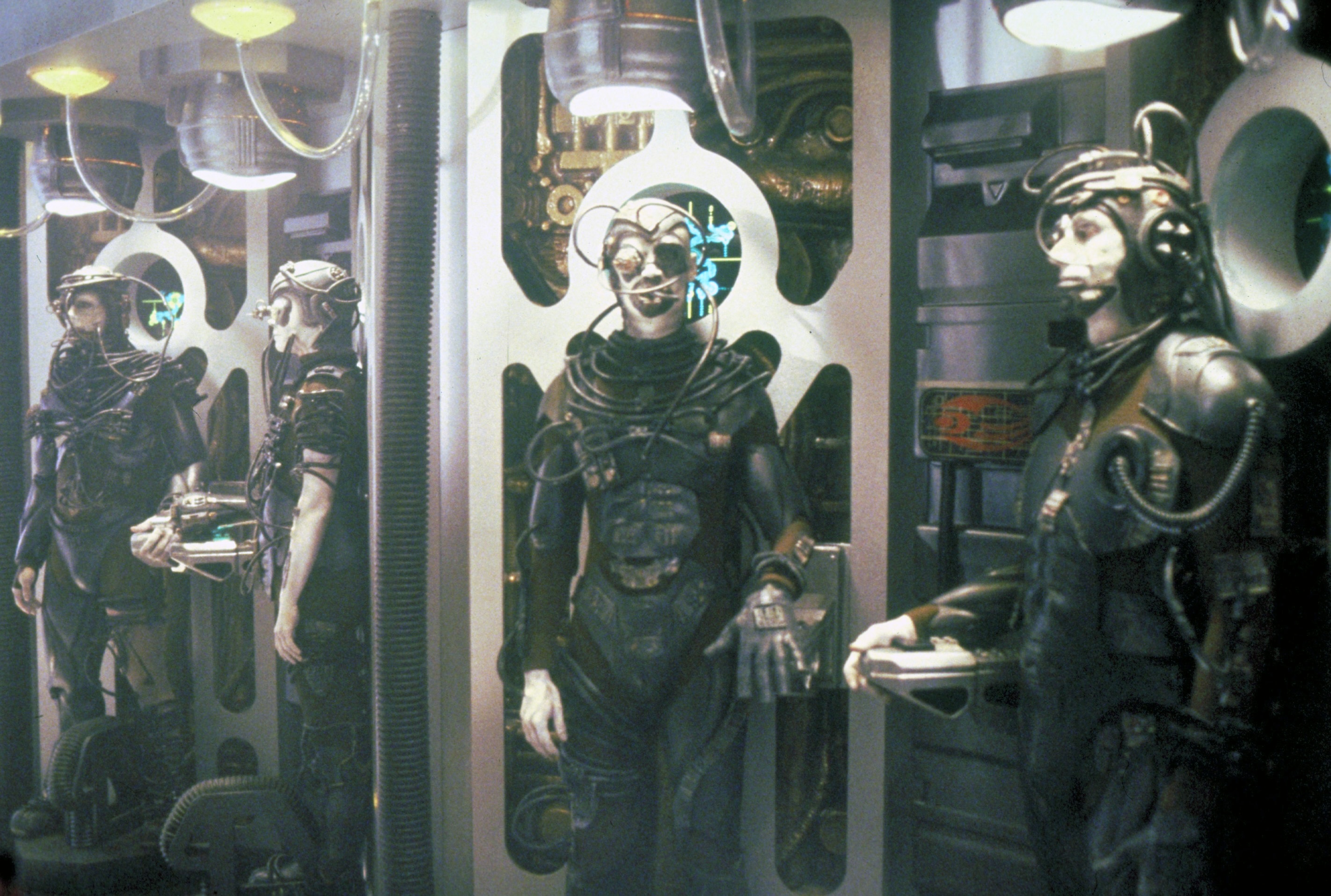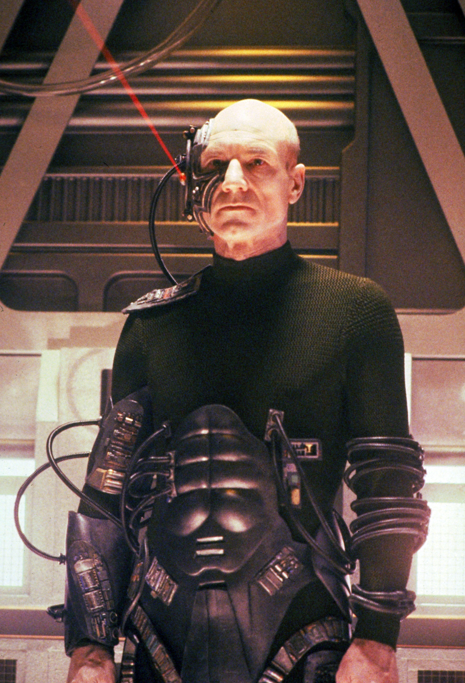 The physical transformation of Stewart into Locutus required hours in the makeup chair as layers of prosthetics and mechanical elements were applied, under the direction of Michael Westmore, whose family’s legacy in Hollywood makeup artistry stretched back to the early 20th century. “[Patrick] got a kick out of his ‘Borgification,’” Berman says. The result was a figure designed to disturb: Picard’s face was still recognizable but threaded with dark tubing, implants, one eye replaced by a glowing red laser and his skin drained of color. He looked less like a captured man than one hollowed out and rebuilt.
