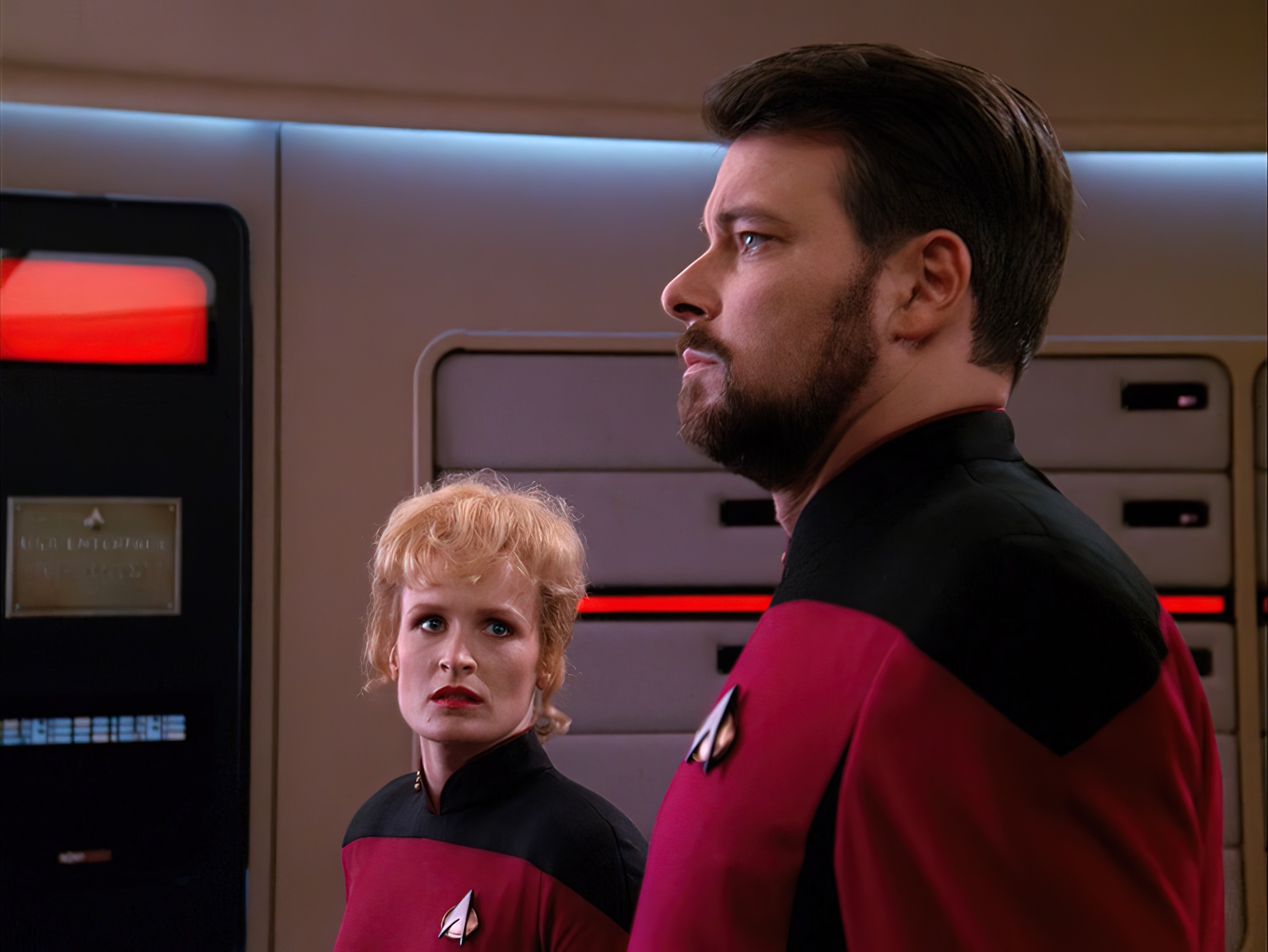 Her obliviousness registered as confidence on camera. But it took a note from director Cliff Bole to sharpen it into a lasting performance. In the turbolift confrontation scene—Shelby’s declaration that Riker is “in my way” in her move up the ladder—Dennehy glared upwards at the considerably taller Frakes, which Bole felt diminished her authority. “He said, plant your feet on the ground and look more straight ahead,” Dennehy says. “Make it look like you’re meeting him eye to eye.” She adjusted her stance, a small intervention that helped unlock the performance. “It changed everything and gave me the character.”