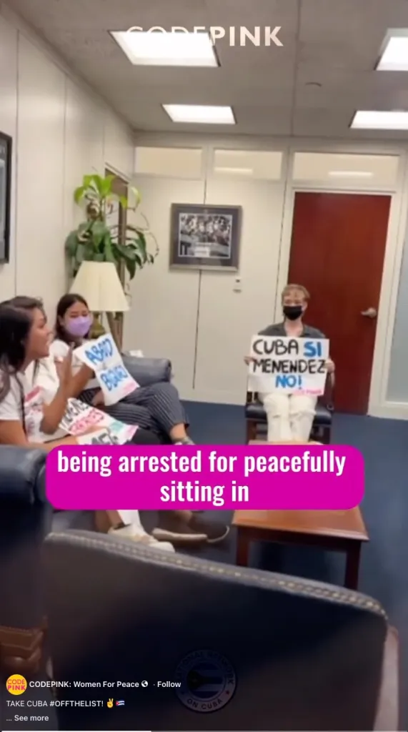 “Bob Menendez cannot claim to support the Cuban people while he upholds this genocidal blockade and thwarts even efforts from within his own party to normalize US-Cuba relations,” Walsh said during the demonstration, according to the CodePink website.