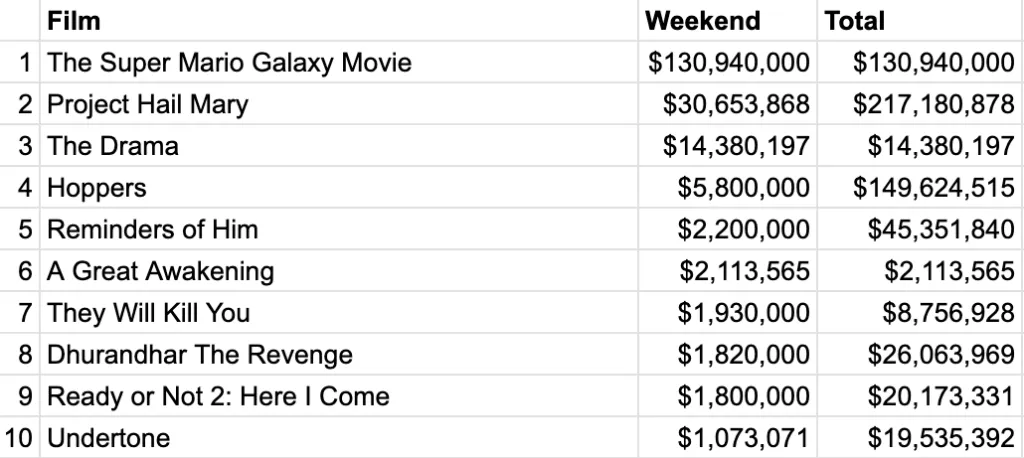 Meanwhile, “Project Hail Mary” is still holding very well despite losing premium format screens to “Mario,” grossing $30 million in its third weekend for a $217 million domestic total. It is the first Amazon theatrical release ever to cross the $200 million mark in North America and stands globally at $420.7 million.