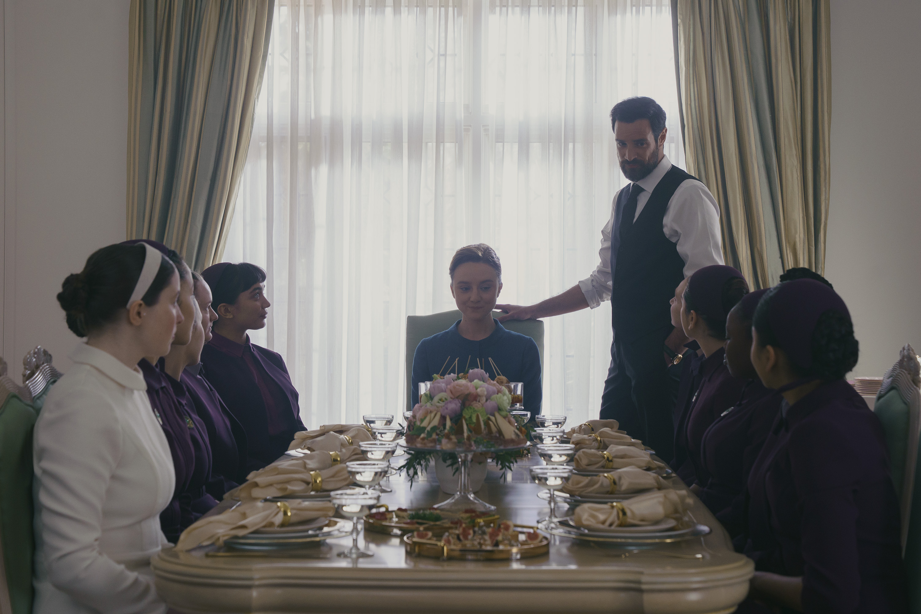What gives The Testaments a YA feel—and viewers some relief from the parade of suffering that was The Handmaid’s Tale—is the school setting, where Agnes’s circle of friends isn’t so different from the typical teen-drama sisterhood. She has an especially close bond with Becka (Mattea Conforti), the first of the group to get her period but the least excited about marriage. Shunammite (Rowan Blanchard) is the queen bee, brash and bossy and far less sophisticated than she pretends to be. (These girls are so sheltered, they’re shocked at the discovery that some men have hairy stomachs.) Sweet, awkward Hulda (Isolde Ardies) is often the target of her ribbing. Pubescent power dynamics aside, the girls are ferociously devoted to one another. They inhabit a world that, on its surface, couldn’t be more different from the shadowy waking nightmares endured by Handmaids. Even though glancing at a member of the opposite sex can get a young woman slut-shamed, they manage to nurse crushes. Agnes moons over Garth (Brad Alexander), a Guardian with boy-band curls who is part of her family’s security detail but doesn’t rank high enough to merit a marriage match. Production design by Martha Sparrow echoes that of girlhood classics like Sofia Coppola’s Marie Antoinette; Bridgerton, another coming-of-age chronicle told through the marriage market, is another clear reference point. The Plums’ princessy bedrooms sprawl across whole wings. Sunbeams stream in through windows. Manicured gardens surround their houses and school. Interiors are decorated in frosting pastels. As one outsider puts it: “Gilead was so beautiful, sometimes I could forget where I was.”
