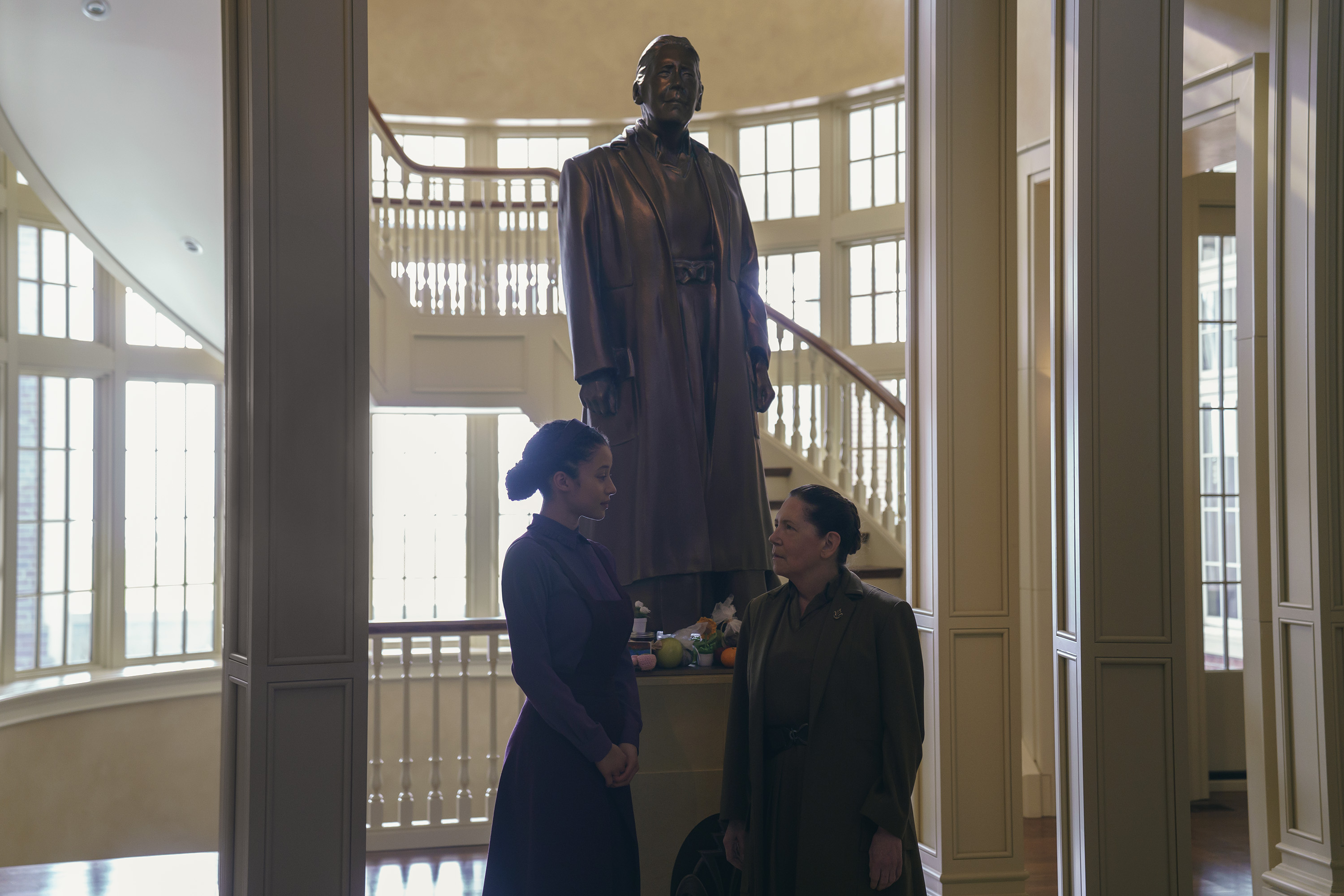 Chase Infiniti, left, and Ann Dowd (and a statue of Ann Dowd) in The Testaments —Russ Martin—Disney