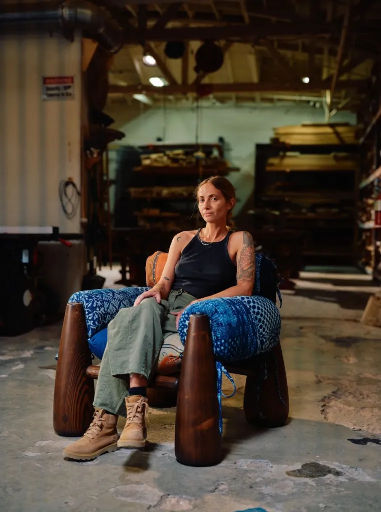 She started training as a woodworker and furniture designer, resolving to construct her own furniture for her home in Los Angeles as her first big project. “I took a class at a woodshop downtown; it just clicked.” Klemick was drawn to using reclaimed wood, and textiles for upholstery — giving it all a second life. Now she runs her own studio, staging exhibitions with sculptural tables and off-kilter chairs that are more like artworks than furniture. “I always want to feel like there’s room to do more and grow,” she says.