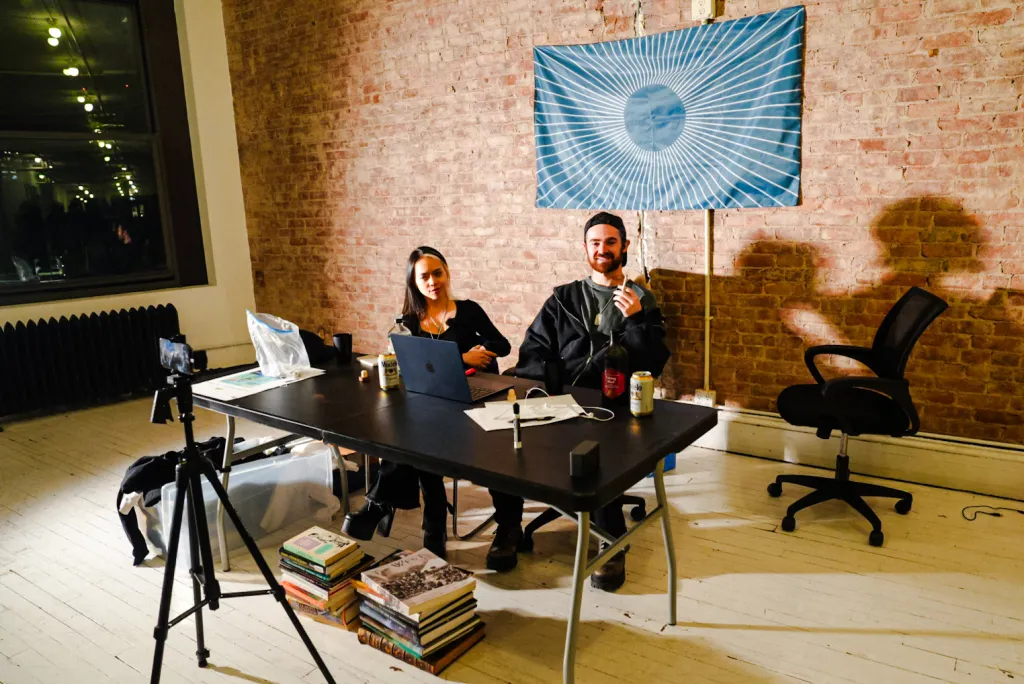 I accept without hesitation, and “God’s Plan” by Drake plays. I’m led to the loft’s front corner, where a makeshift studio has been fashioned near the window with only a little mounted tripod and a pop-up table. The Praxis flag, a trippy navy and white geometric pattern vaguely reminiscent of Imperial Japan, or the Nazi Sonnenrad, is tacked to the wall behind Dryden Brown and a bunch of e-girls. We make cordial introductions, but don’t really chat much. I sit in front of the computer and they ask me some basic questions for the approximately 20 people watching: What’s my height, am I vaxxed, do I drink whole milk, do I take peptides. The streamers aren’t really interested in me, though. They’re interested in the girls, especially this Brazilian, who they keep hounding for her 23andMe data, probably to gauge whether she’s genetically pure enough to mate with. She balks, saying she’d never turn over that information to the government, and the online simps swoon even harder.