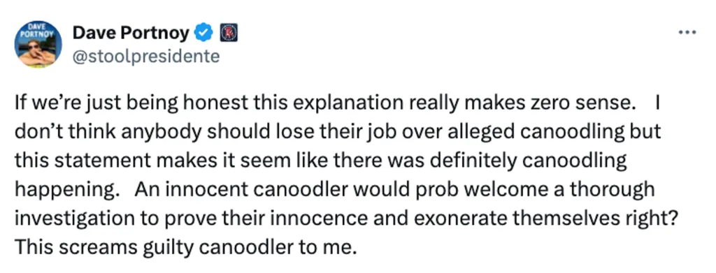 “If we’re just being honest this explanation really makes zero sense. I don’t think anybody should lose their job over alleged canoodling but this statement makes it seem like there was definitely canoodling happening,” the Barstool Sports founder wrote via X Tuesday.
