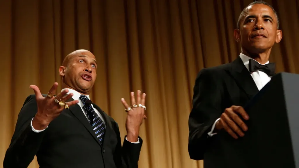 Barack Obama speaks next comedian Keegan-Michael Key playing “Luther, Obama’s anger translator” at the White House Correspondents’ Association Dinner in 2015. (Photo by YURI GRIPAS/AFP via Getty Images)
