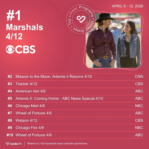 In our regular programming, the Taylor Sheridan “Yellowstone” spinoff “Marshals” returns to the top spot this week. “Tracker” rises back up to third place, and “American Idol” tumbles to fourth this week.