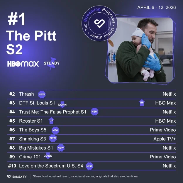 That’s what makes “The Pitt” on HBO Max so remarkable. The emergency room drama was no stranger to the Top 10 in its first season, but it hung towards the bottom. A few major award wins and some word-of-mouth buzz led to a steady rise in weekly viewership throughout season two. Now we find “The Pitt” topping the chart for a month straight.