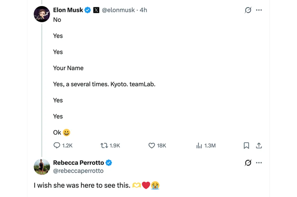 Rebecca responded to Musk’s answers with a tear-jerking, “I wish she was here to see this.”