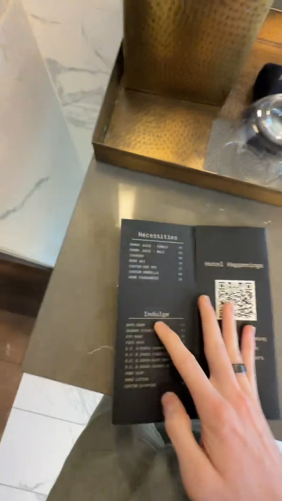 In a viral TikTok, traveler Jaden Warren reveals the minibar menu hidden behind the bathroom display. @jadenllc/TikTok