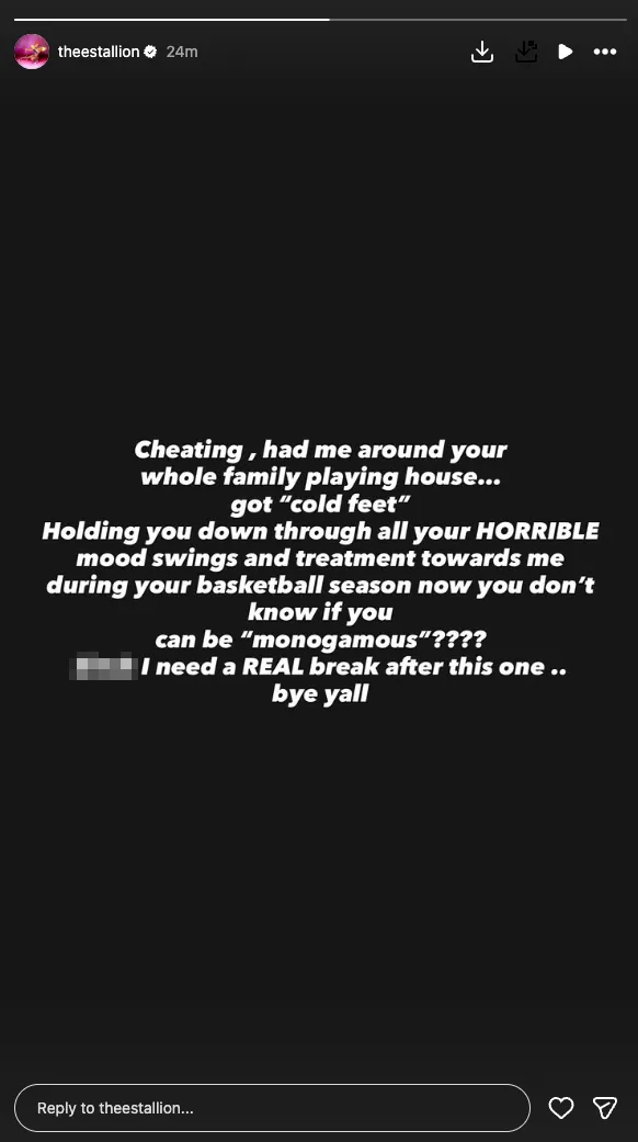 “Cheating, had me around your whole family playing house… got ‘cold feet,’” she wrote on her Instagram Stories Saturday (as seen above). Megan Thee Stallion/Instagram