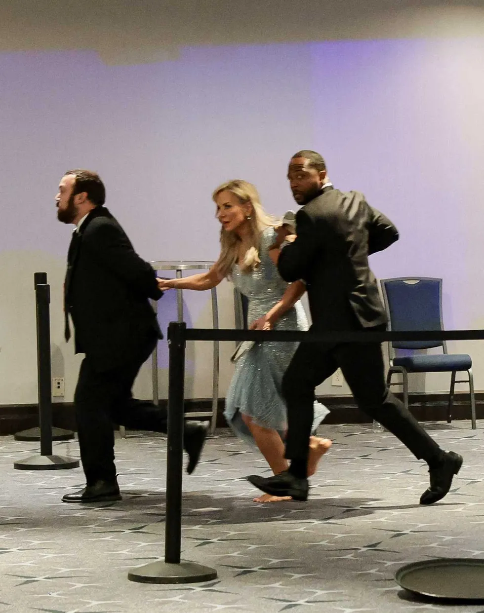 An attendee is evacuated from the venue as a shooter opens fire during the annual White House Correspondents’ Association dinner.