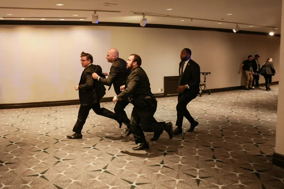 Security officials evacuate a guest as a shooter opens fire during the annual White House Correspondents’ Association dinner.