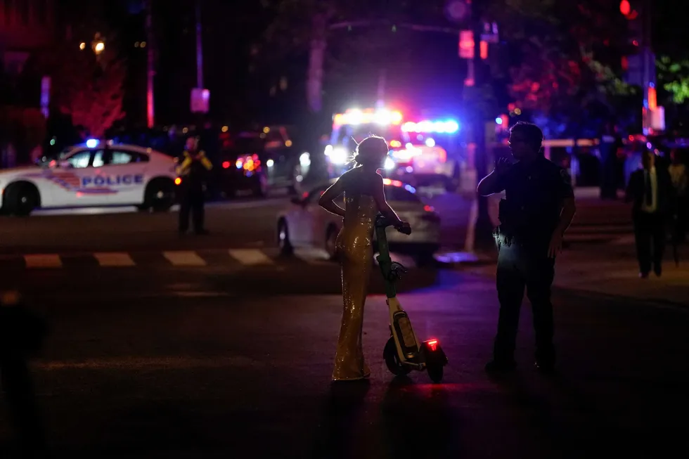 An attendee uses a scooter after leaving the annual White House Correspondents’ Association dinner after a reported shooting incident in Washington, D.C., U.S.