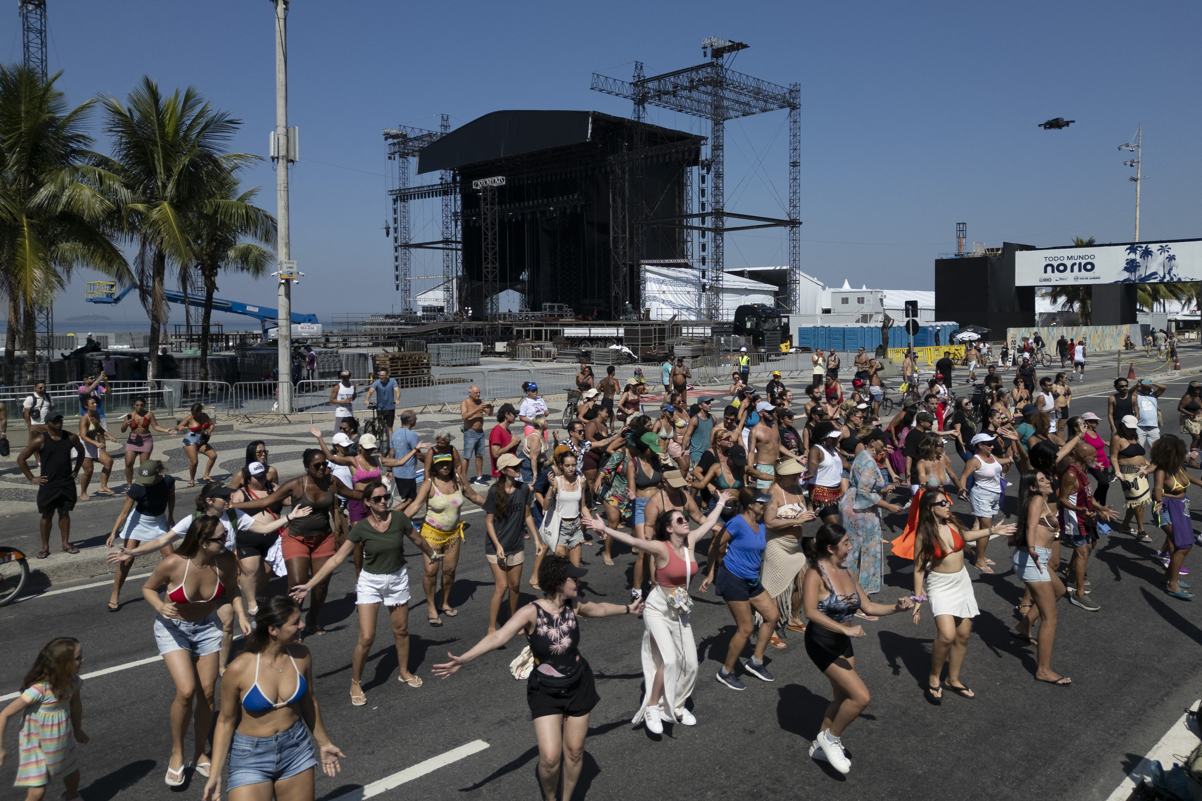Aerial view of tents being set up for a Shakira concert at Copacabana Beach in Rio de Janeiro, Brazil.