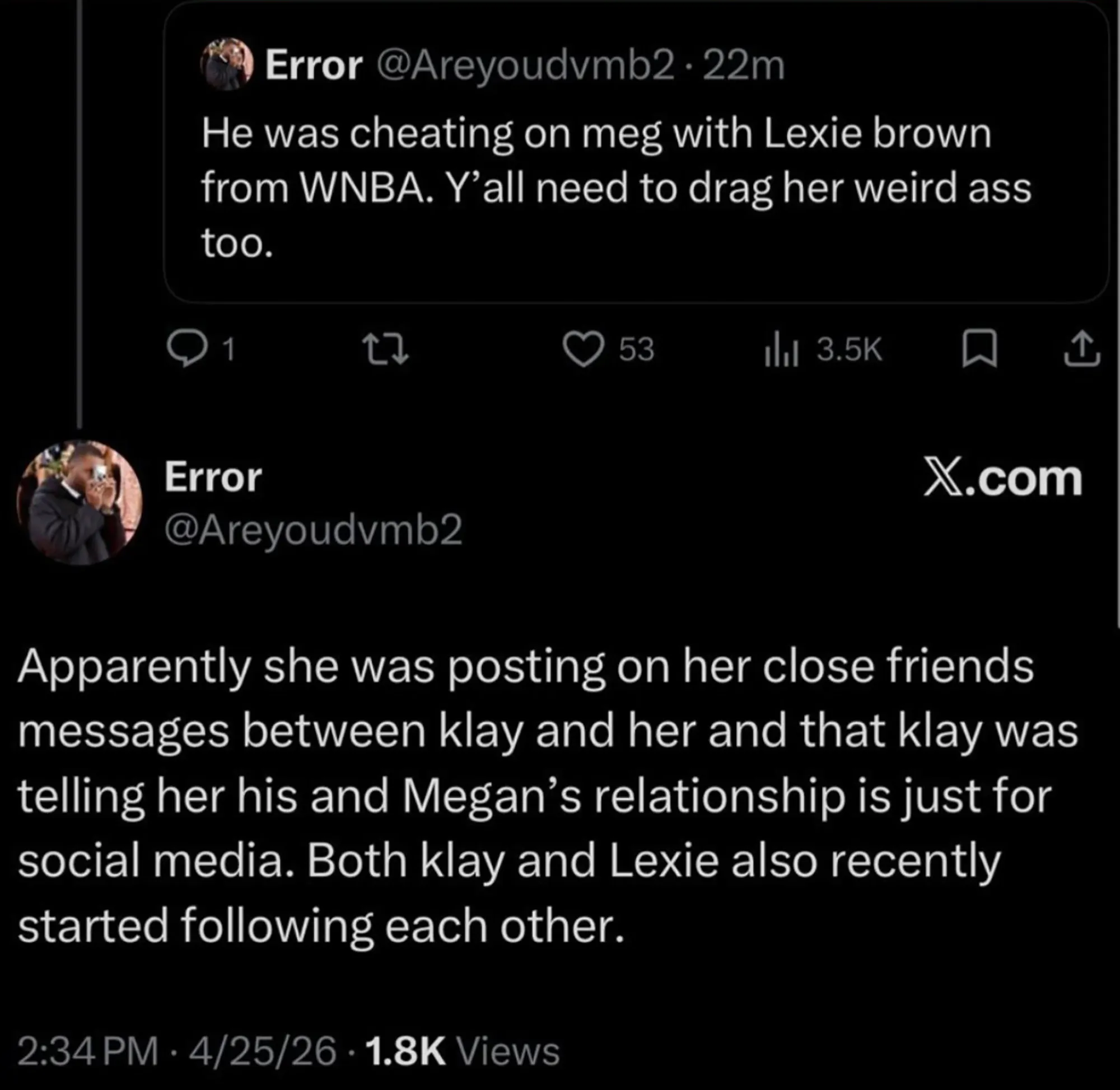 One X user — whose tweets are now protected — claimed Brown was “posting on her close friends” messages between herself and the Dallas Mavericks star in which he claimed his romance with the “WAP” rapper was “just for social media.”