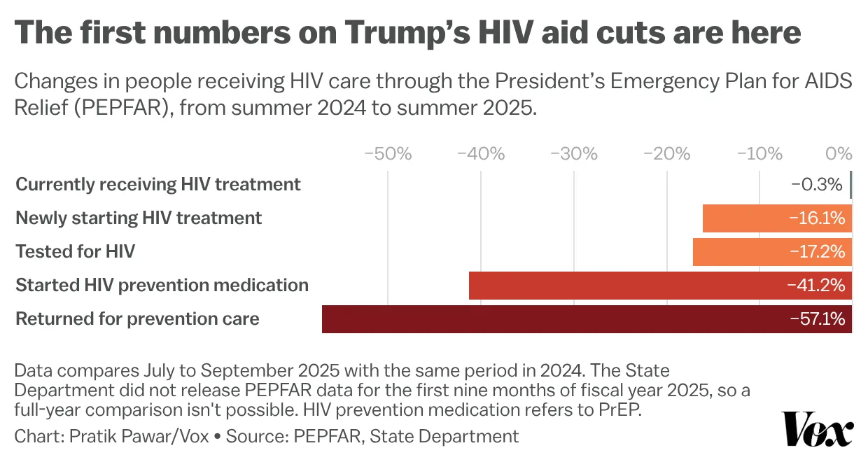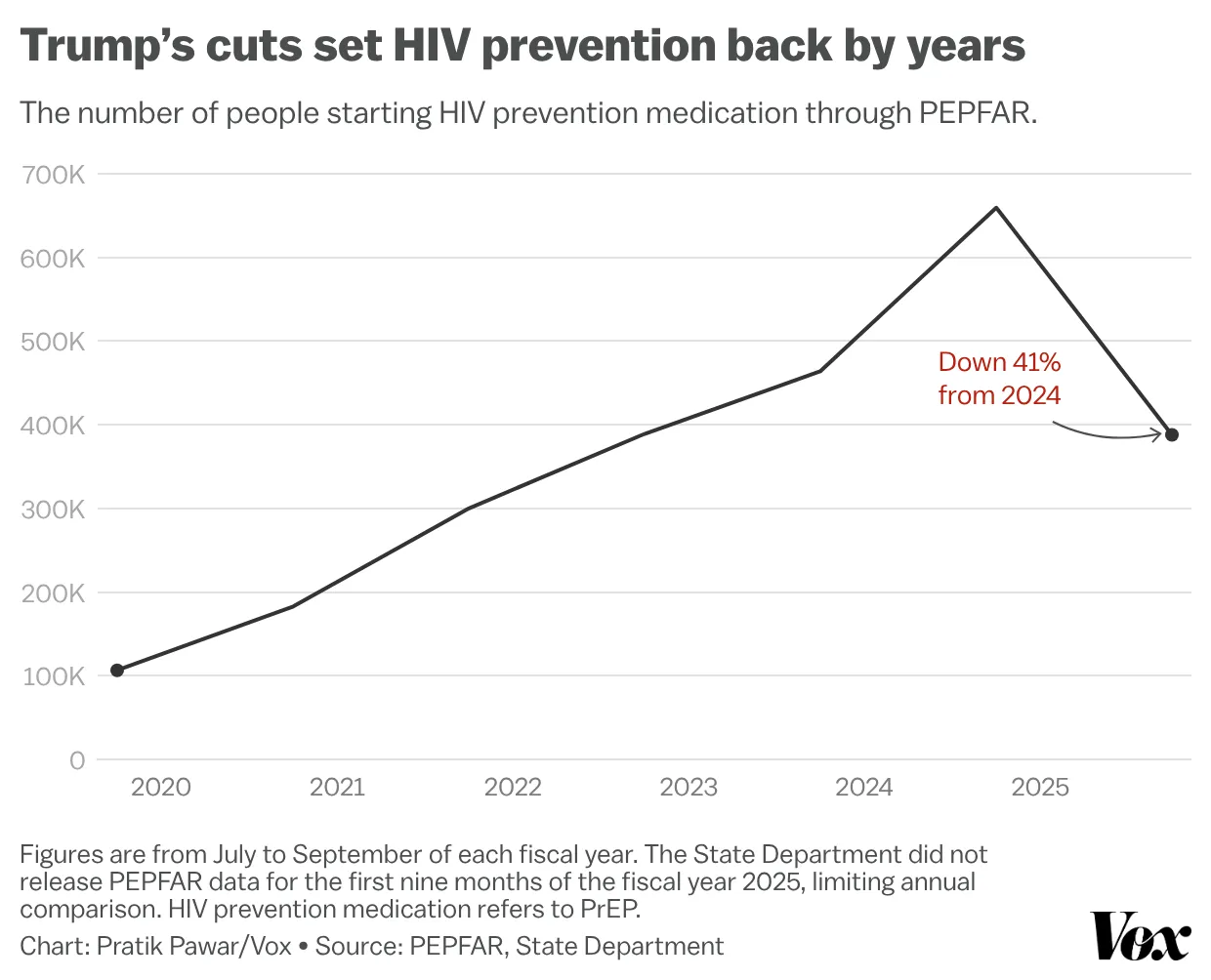 PEPFAR tested about 4 million fewer people for HIV in the last quarter of 2025 than in the same period a year before, a 17 percent drop. The number of people newly starting on HIV treatment also fell, from about 463,000 to 389,000, a decline of 16 percent. And PrEP, the daily pill that prevents HIV infections, took an even bigger hit: with new enrollments falling by about 270,000 people, 41 percent, while the number of people returning for follow-up dropped by nearly 60 percent.